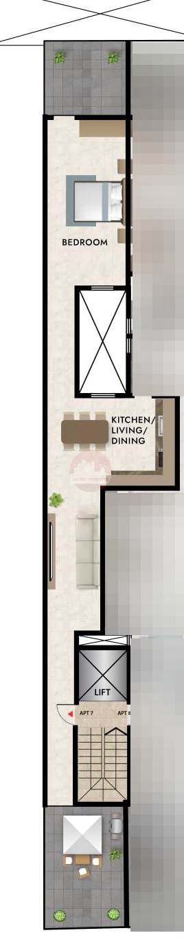 Consists of an open-plan kitchen/dining/living area with a front terrace, a main bathroom, and a double bedroom with ensuite.