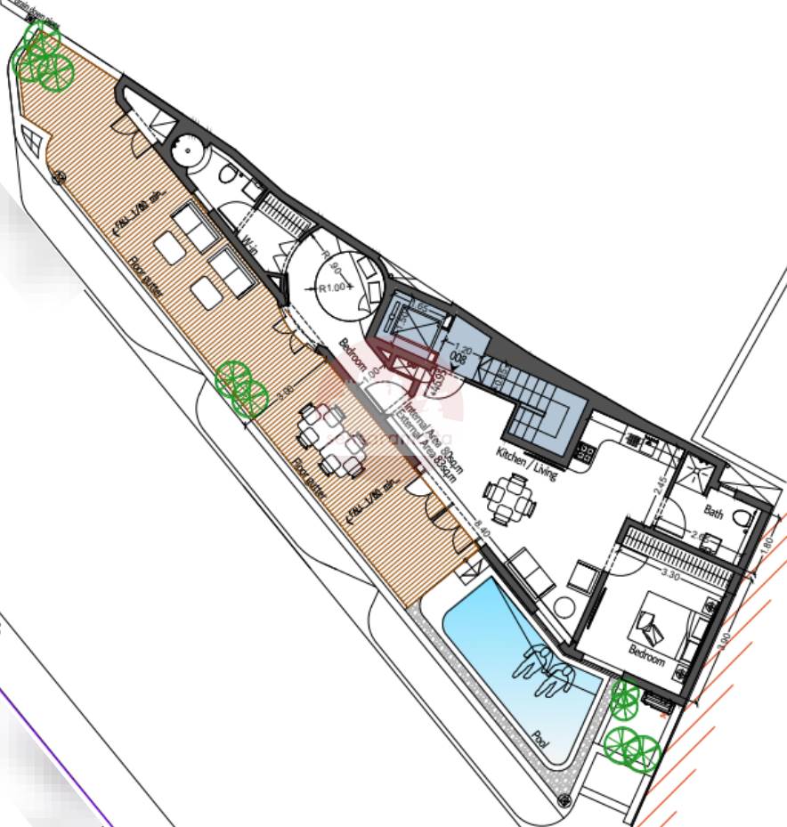 This spacious forth-floor penthouse in Zabbar presents an accommodation which includes an open plan kitchen/dining/living with a longish beautiful front terrace, a main bathroom, two double bedrooms, main with ensuite and walk-in wardrobe. Both bedrooms enjoy access to the 83sqm terrace which has also space for a pool.