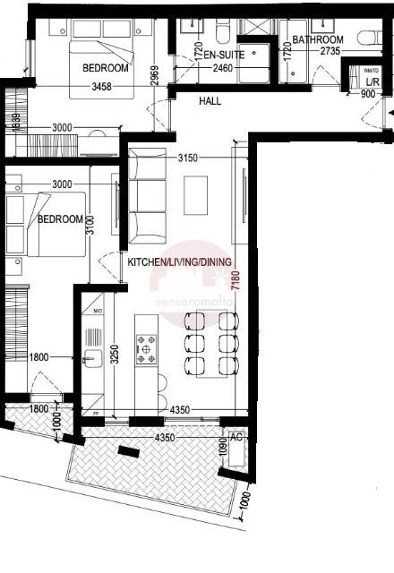 The layout comprsies of and open plan K/D/L with a front terrace, main bathroom, and two double bedrooms. The main bedroom includes an en-suite, and the second bedroom has its own balcony.