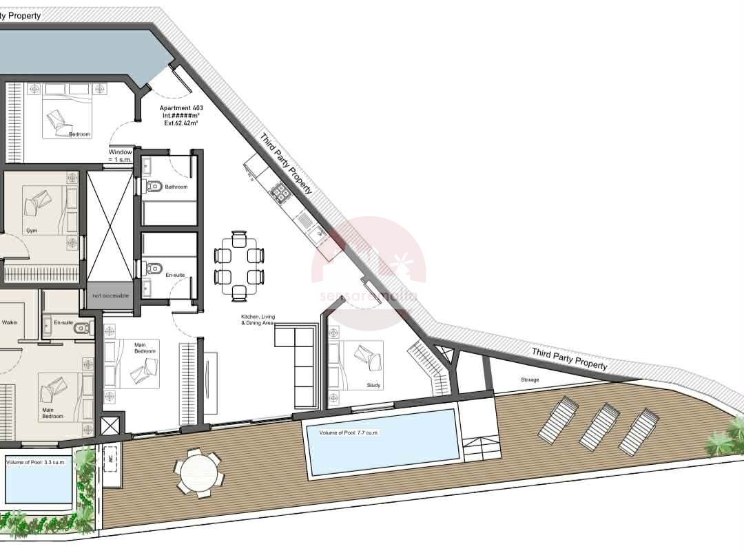 This Penthouse is situated on the 4th floor and consist of 2 double bedrooms main with an en-suite, main bathroom a study room, laundry room and an open-plan kitchen/living/dining at the back of the property followed by a good sized front terrace with pool
