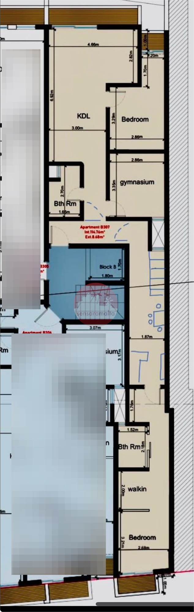 Upon entering one finds a kitchen/living/dining/balcony, bathroom/balcony, bedroom, gym, second bedroom with an ensuite and walkin wardrobe.
