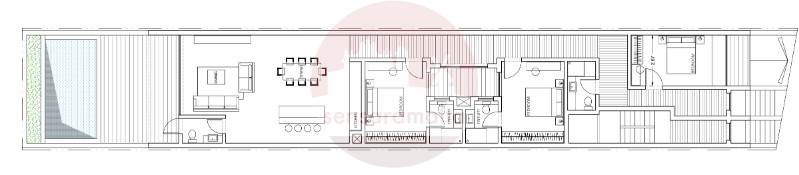 The layout comprises of a hallway upon entering, a double bedroom on the right hand side, main bathroom and another two double bedrooms (both of them with an ensuite bathroom) on the right hand side and opens to a kitchen/dining/living with a back yard complemented by a pool at the back.