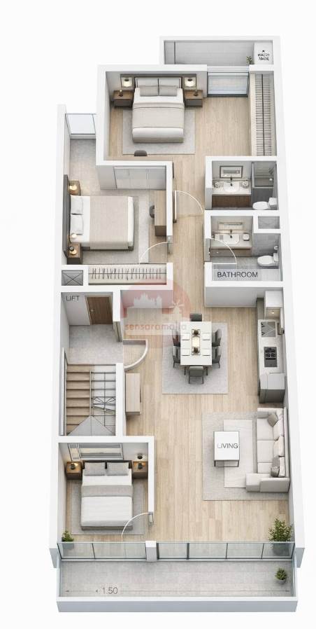 The layout comprises of an open plan kitchen/dining/living with a front terrace, main bathroom and three double bedrooms. The master bedroom includes an ensuite bathroom an is also complemented by a balcony.