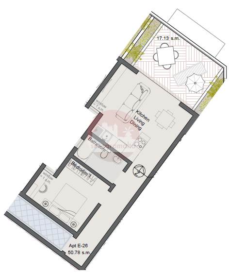 Layout consisting of a Kitchen/Living/Dining with a good sized terraced, Double Bedroom, Main Bathroom and back Veranda.